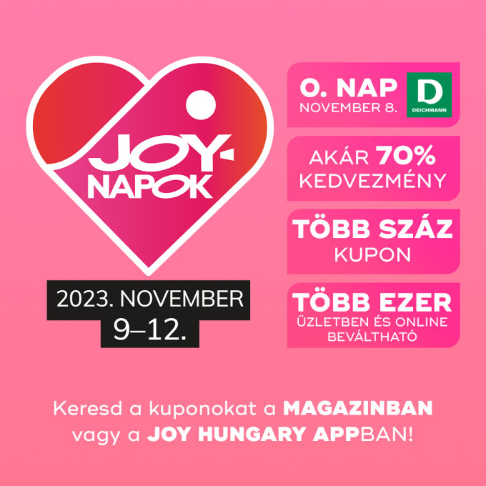 Spórolni a Joy-napokon tudsz igazán! November 9-12. között több száz kuponnal vásárolhatsz kedvezményesen számos márka és üzlet kínálatából! A kedvezményre jogosító kuponokat keresd a legfrissebb Joy Magazinban az újságárusoknál vagy a JOY Hungary applikációban. További részletekért KATTINTS!